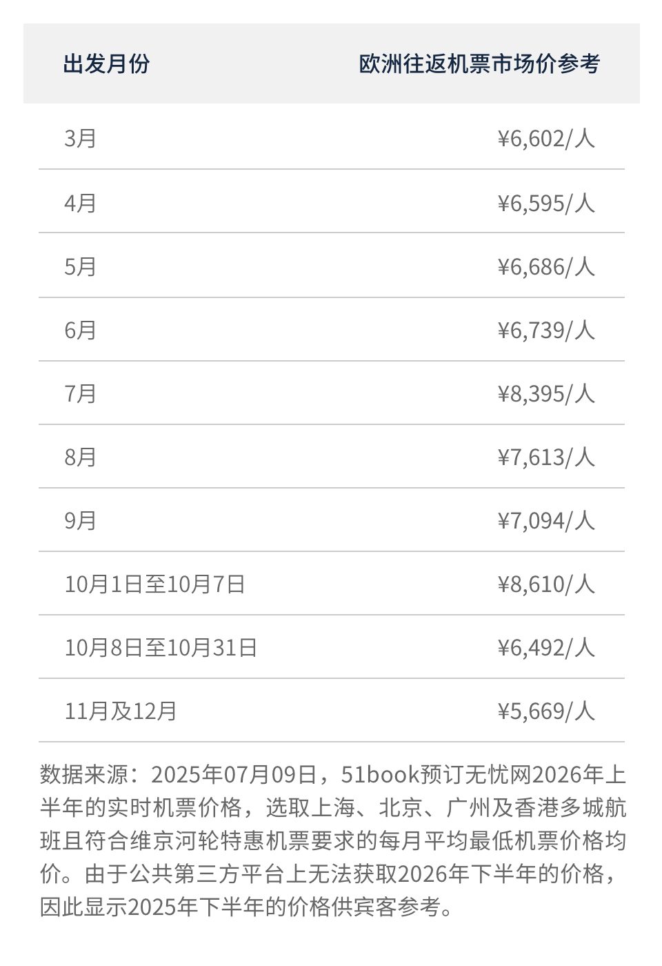 5. 以上价格不适用于指定门户城市以外的航班。这些门户城市可能因多种原因(如我们的航司供应商或他们的航班发生变化)而不时变更,维京游轮有权更新门户城市。如有变更我们将在官网上及时更新,恕不另行通知;